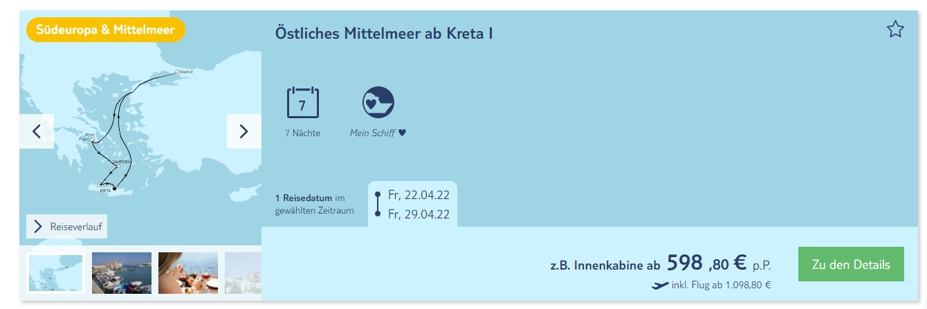 So gilt das Angebot auch für den günstigen PUR-Tarif, außerdem gibt es noch einen weitere Bonus: die „Mein Schiff Urlaubsgarantie“. Mit dieser bleibt ihr bei eurer Urlaubsplanung flexibel: Bis 30 Tage vor Reisebeginn könnt ihr kostenfrei umbuchen! Großartig ist außerdem, dass der Nachlass von 60% auf alle Kreuzfahrten mit Abfahrtdatum bis Ende Mai gilt.