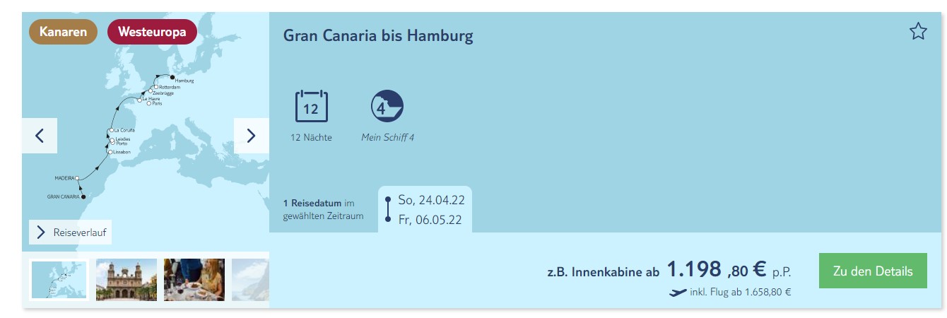 Mit der Mein Schiff Urlaubsgarantie bleiben Gäste in ihrer Urlaubsplanung flexibel: Bis 30 Tage vor Reisebeginn kann kostenfrei umgebucht werden. Dies gilt für alle Neubuchungen im PRO- und im PLUS-Tarif, die vom 1. April bis 31. Mai getätigt werden und wo die Abfahrten zwischen dem 1. Mai und 31. Oktober 2022 liegen. Ausgenommen davon sind Eventreisen.