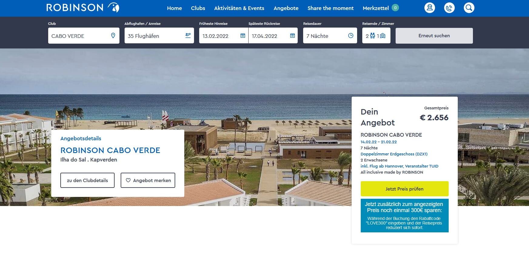Dank Valentinstag gibt es ein kurzfristiges Angebot bei Robinson Club. Bis zu 300 Euro Rabatt pro Buchung könnt ihr mit dem Aktionscode LOVE300 pro Buchung bis 14. Februar sparen. Möglicher Reisezeitraum ist bis 30. September, ihr könnt den Aktionscode aber auch auf Last Minute-Angebote einsetzen und doppelt sparen. Großartig ist außerdem, dass TUI Protect ebenfalls enthalten ist.