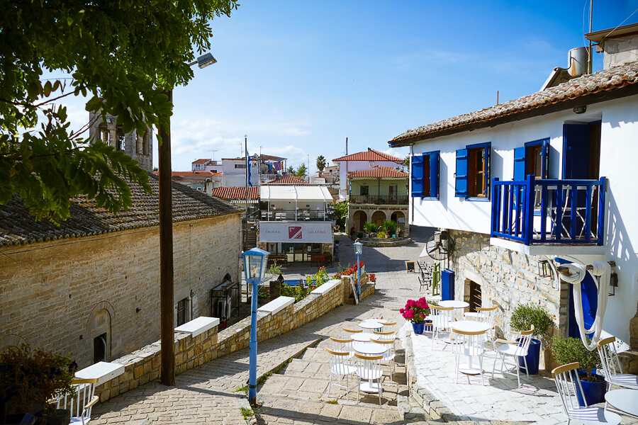- Old Nikiti (Sithonia): Das malerische Dorf erwartet dich mit einer charmanten Altstadt, verwinkelten Gassen, Kopfsteinpflaster, traditioneller Architektur, zauberhaften Gärten, gemütlichen Tavernen und urigen kleinen Geschäften. Zudem gibt es einen Bauernmarkt, wo du lokale Produkte wie Kiefernhonig und Olivenöl erwerben kannst. Über allem erhebt sich die hübsche Dorfkirche Ágios Nikitas, von der aus man einen wunderschönen Blick über die Ägäis genießen kann.