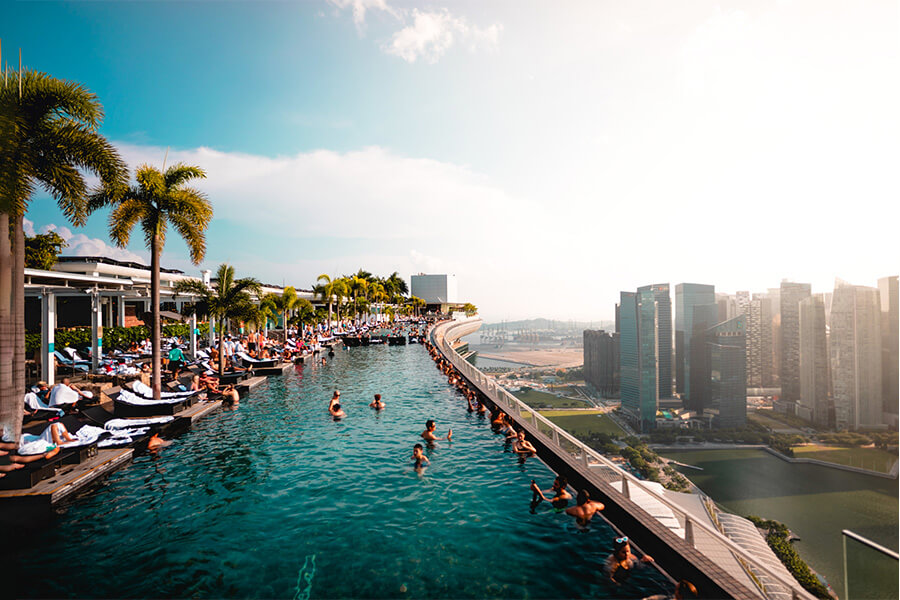 Eines der bekanntesten Luxushotels in Singapur ist das Marina Bay Sands. Mit seinen drei Türmen und dem berühmten Infinity Pool auf rund 200m Höhe ist es ein architektonisches Meisterwerk und bietet atemberaubende Ausblicke auf die Stadt.