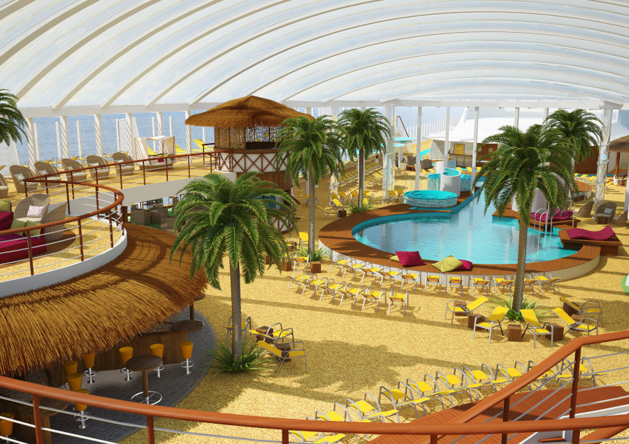 Eine Innovation bei AIDA ab der Hyperion-Klasse ist der Beach Club. Er besteht aus einem UV-lichtdurchlässigen Foliendom und bietet Platz für die AIDA Bar, gemütliche Sitz- und Liegegelegenheiten sowie einen Teil des Poolbereichs. Auf Deck 16 gelegen, lädt er das ganze Jahr über zum Entspannen und schwimmen unter dem geschützten Kuppeldach ein, während man die Atmosphäre genießt. Abends gibt es hier wiederum ein abwechslungsreiches Unterhaltungsprogramm und köstliche Cocktails und Getränke, um den Tag ausklingen zu lassen.