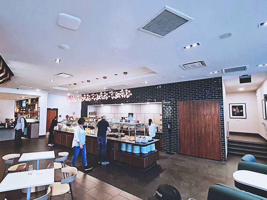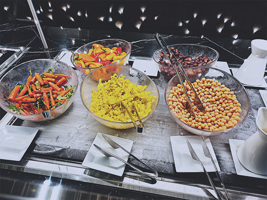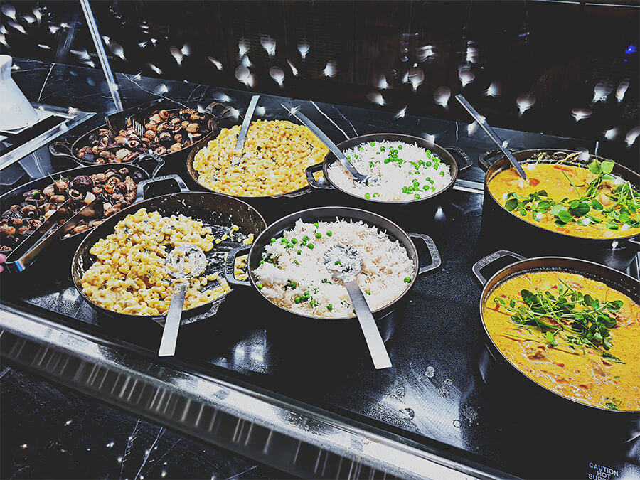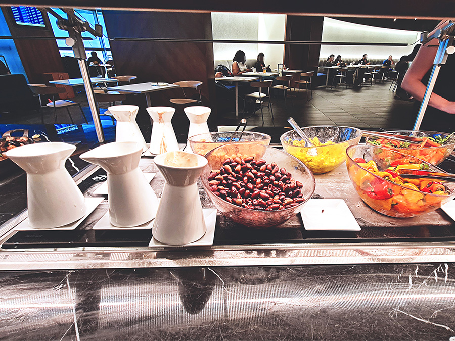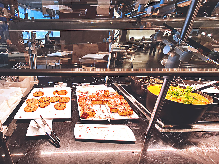 Im hinteren Teil der Lounge befindet sich der großzügige Buffetbereich. Hier kann man an einem großen Buffetblock aus kalten und warmen Gerichten auswählen.