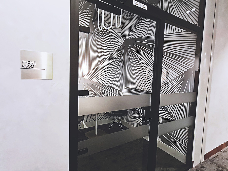 Gegenüber dem verglasten Raum befanden sich zwei Telefonkabinen mit maximaler Privatsphäre, die auch eine Sitzgelegenheit boten.