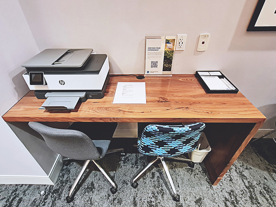 Im linken Teil der Lounge gibt es einen speziellen Arbeitsbereich. Hier befindet sich ein langer Tisch mit mehreren Sitzplätzen, amerikanischen Steckdosen und USB-Lademöglichkeiten.