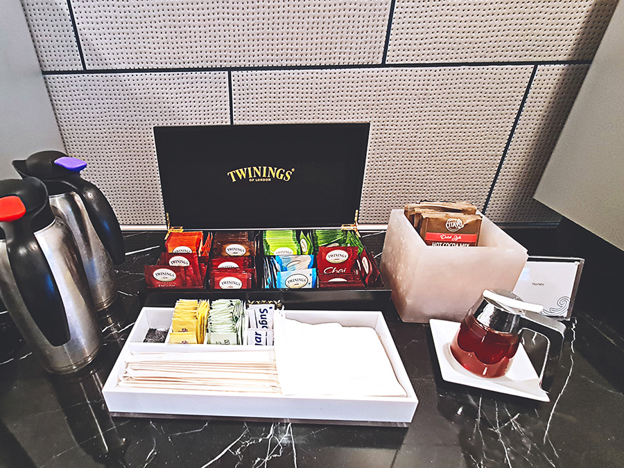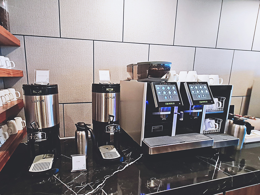 Neben dem großen Bar- / Buffetbereich am Ende der Lounge findet sich in der Nähe der Arbeitsbereiche noch eine weitere Selbstbedienungs-Getränkestation. Dort gibt es einen Kaffeevollautomat mit einer großen Auswahl an Heißgetränken, diverse Teesorten, Filterkaffee-Spender, Eistee und Sirup-Karaffen.