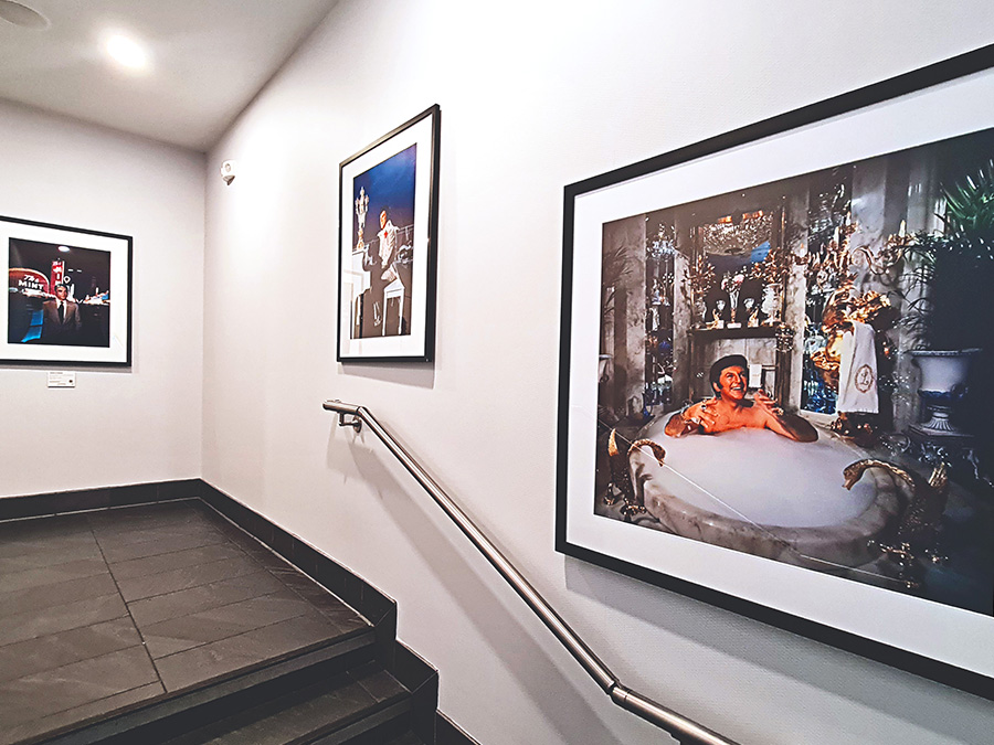 Ein Teil der Lounge bietet große Panoramafenster mit viel Tageslicht und Sitzecken mit Blick auf das Vorfeld. Die ganze Lounge strahlt ein hochwertiges und zeitgemäßes Ambiente aus, die dekorierten Ecken wirken sehr gemütlich und ansprechend. Überall hängen Bilder, großteils von Stars bei ihrem Besuch in Las Vegas – eine nette Idee.