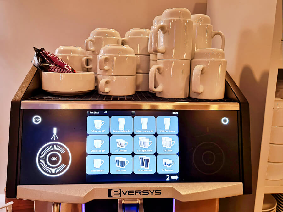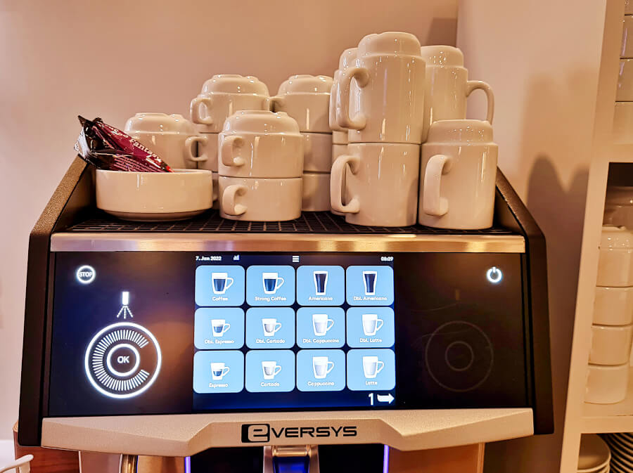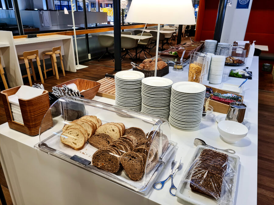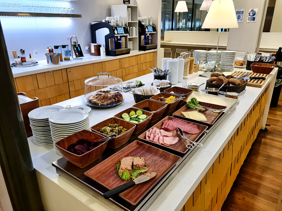 Die Auswahl an Getränken war solide. Speziell die beiden Kaffeeautomaten hatten eine umfangreiche Auswahl. Auch gab es neben Wein und Bier eine kleine Auswahl an Spirituosen. Bei der Essensauswahl ist noch ein wenig Luft nach oben. Sie ist gut für ein kleines Frühstück oder einen Snack, aber auch nicht so umfangreich wie manch andere Lounge. Speziell eine warme Essensauswahl wie Rührei am Morgen, mittags / abends eine Suppe und ein warmes Gericht wären schon noch passend gewesen. Auch gab es keinerlei Knabbereien: Weder Nüsse, Chips, Kekse, Kuchen, oder ähnliches.