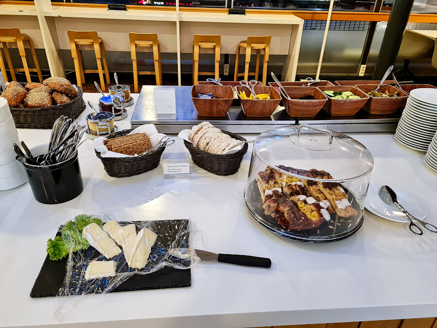 Verschiedene Brot- und Brötchensorten, Knäckebrot, Reiswaffeln, Wurst- und Käseaufschnitt, Camembert, Paté, Marmeladen und Honig, Butter, Gurken und Paprika, Oliven, sowie eingelegte Paprika. Als süße Option gab es noch eine Art Hefezopf mit Vanillepudding und Zimt.