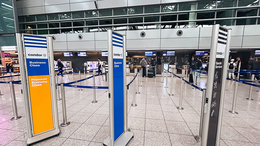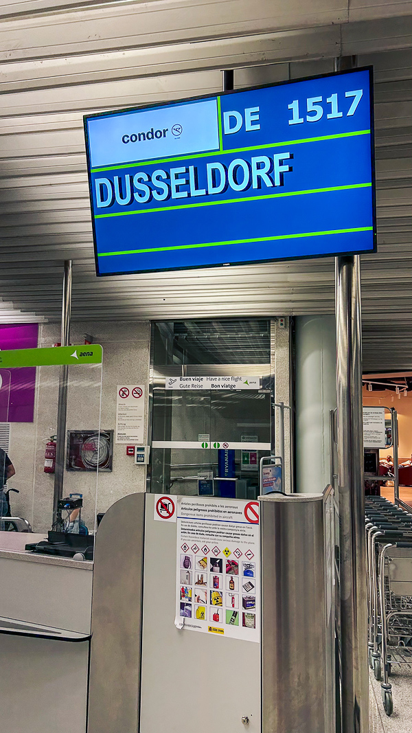 Am Flughafen Palma de Mallorca gibt es mehrere Check-in-Schalter von Condor. Während sich bei der Economy Class eine lange Schlange bildete, war der Schalter für die Business Class nahezu leer. Da wir nur mit Handgepäck unterwegs waren und bereits online eingecheckt hatten, konnten wir direkt zur Sicherheitskontrolle gehen. Dank eines separaten Priority Lane-Eingangs mussten wir nur etwa 5 Minuten warten. Leider gab es noch keine modernen Scanner, sodass Laptops und Flüssigkeiten herausgenommen werden mussten.