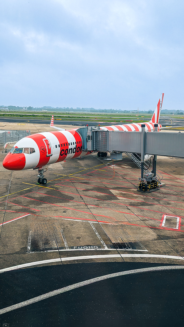 In der Condor-App wurde der Flug weiterhin als pünktlich gelistet, doch weit und breit war kein Flugzeug zu sehen. Erst als der Flug eigentlich hätte starten sollen, erschien endlich ein Mitarbeiter am Boarding-Schalter. Das Boarding verlief danach zügig, und wir konnten als Teil von Boardinggruppe 1 als Erste an Bord gehen.