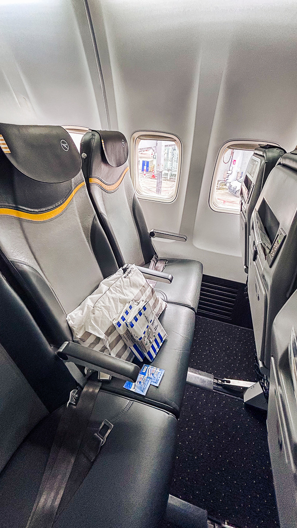 Der Sitzkomfort war durchschnittlich, aber für einen kurzen Flug völlig ausreichend. Die Kabine, in grau-gelben Farben gestaltet, wirkte modern und gepflegt. Da wir zu den Ersten an Bord gehörten, fanden wir in Reihe 3 genügend Platz in den Overhead Bins, um unser Gepäck bequem zu verstauen. Insgesamt war die Kabine in gutem Zustand und sauber. Der ausklappbare Tisch war stabil, jedoch leider nicht verschiebbar.