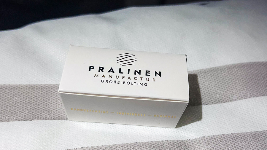 Zum Ende des Fluges bekamen wir überraschenderweise jeder noch eine kleine Schachtel mit zwei sehr leckeren Trüffelpralinen als nette Geste. Eine wirklich angenehme und leckere Überraschung, mit der wir nicht gerechnet hatten, da diese auf dem Hinflug entweder vergessen wurde oder gar nicht an Bord war.