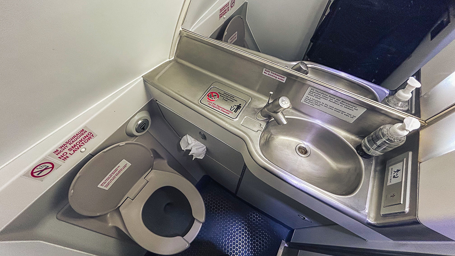 Direkt dahinter waren die Economy Class-Sitzreihen, die nicht durch einen Sichtschutz oder Vorhang abgetrennt waren, wie es bei anderen Airlines oft üblich ist. Ohne diese Abtrennung nutzen in der Regel alle Passagiere die vordere Toilette, was zu längeren Warteschlangen führen kann. Dadurch entfällt der Vorteil, dass man sich mit einem Business Class Ticket die Toilette mit weniger Passagieren teilen muss. Der Waschraum war, wie in der Economy-Klasse üblich, beengt, aber sauber.