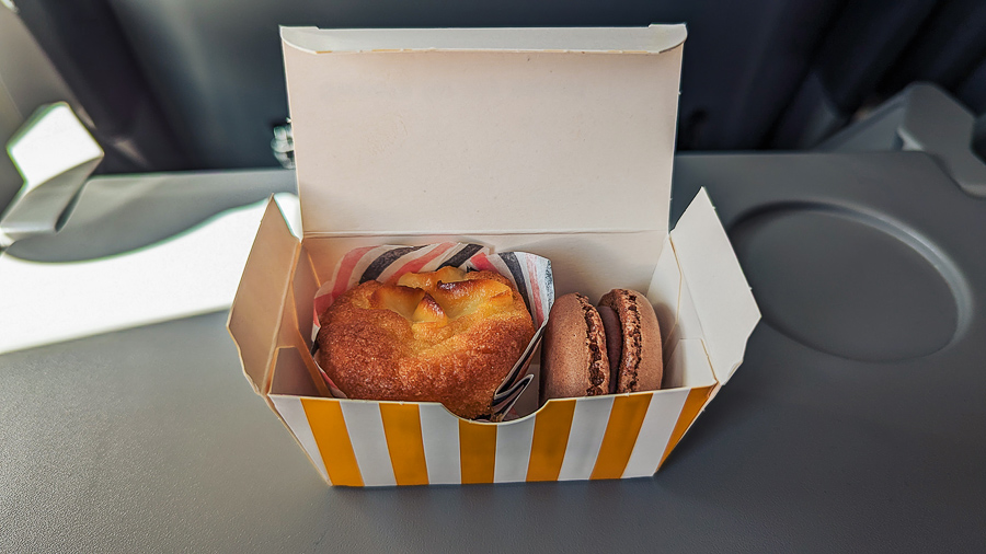 Nach dem Getränkeservice wurden die vorbestellten Mahlzeiten serviert. Wir entschieden uns für das Amerikanische Omelette mit Frischkäsefüllung, Röstistreifen, Paprikagemüse und Rapsblüte. Weitere Auswahlmöglichkeiten waren z.B. Thailändisches rotes Curry, Pasta Bolognese, Currywurst, Linsen-Dal, englisches Frühstück und mehr. Zum Dessert gab es Mini-Napfkuchen und ein Schokoladen Macaron.