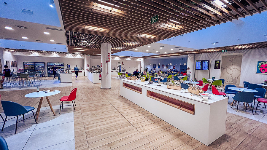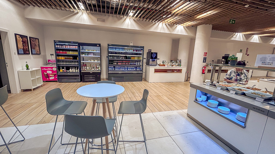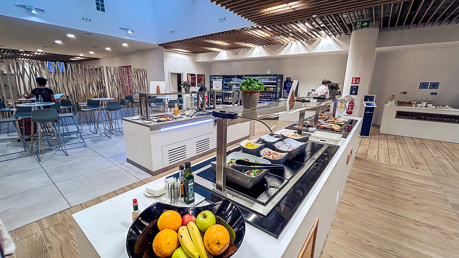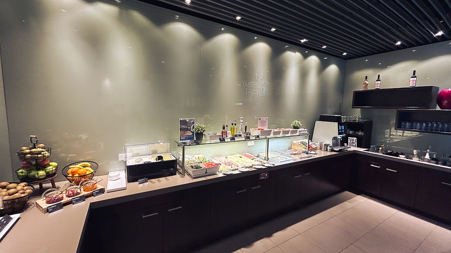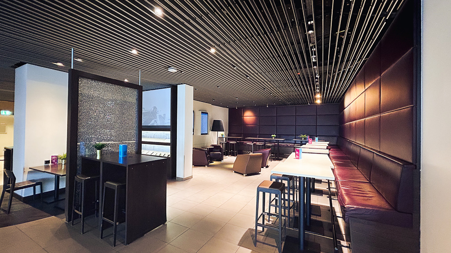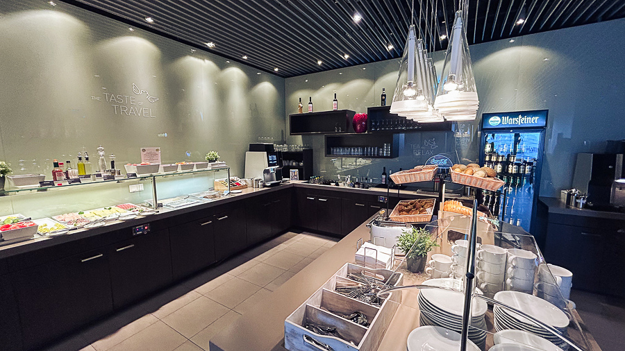 Obwohl die Lounge sehr groß ist und zahlreiche Sitzmöglichkeiten bietet, mussten wir lange suchen, bis wir einen freien Tisch fanden. Enttäuschenderweise waren alle Mitarbeiter damit beschäftigt, das Buffet aufzufüllen, und erst nach mehrmaligem Bitten kam nach 20 Minuten jemand, um den Tisch zu säubern und das Geschirr abzuräumen. Abgesehen davon gibt es wenig Grund zur Kritik. Die Lounge ist modern, hell und großzügig gestaltet, und das Getränke- und Essensangebot ist recht umfangreich, auch wenn es keine warmen Speisen gibt.