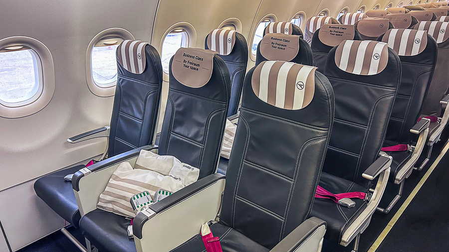 Wie auf dem Hinflug gab es eine 3-3-Sitzkonfiguration und keine separate Business Class Kabine, sondern wieder lediglich drei Reihen für Business Class-Ticket-Inhaber. Der mittlere Sitz blieb frei, jedoch handelte es sich auch hier um normale Economy Class Sitze mit einem engen Sitzabstand. Für den Rückflug hatten wir unsere kostenlose Sitzplatzreservierung genutzt, um in der ersten Reihe zu sitzen. In der ersten Reihe gibt es keinen Vordersitz, allerdings schränkt eine Trennwand den Fußraum etwas ein. Wir konnten unsere Beine nicht vollständig ausstrecken, aber der Platz reichte für den zweistündigen Flug nach Düsseldorf völlig aus.