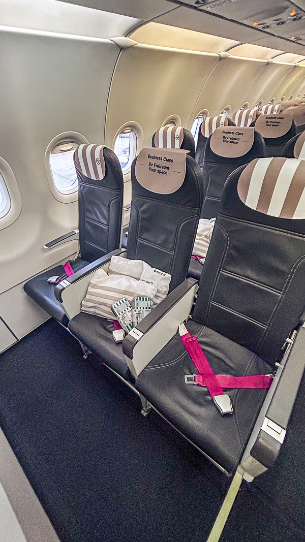 Der Flug nach Mallorca wurde mit einer Boeing 757-300 durchgeführt, die keine speziellen Business Class Sitze hat, sondern, wie erwähnt, normale Economy Sitze mit freiem Mittelsitz. Mit nur 74 cm Sitzabstand also recht wenig Beinfreiheit und so fühlte sich der Platz recht beengt an. Die Maschine hatte eine 3-3-Konfiguration und auf unserem Flug gab es 3 Reihen in der Business Class.