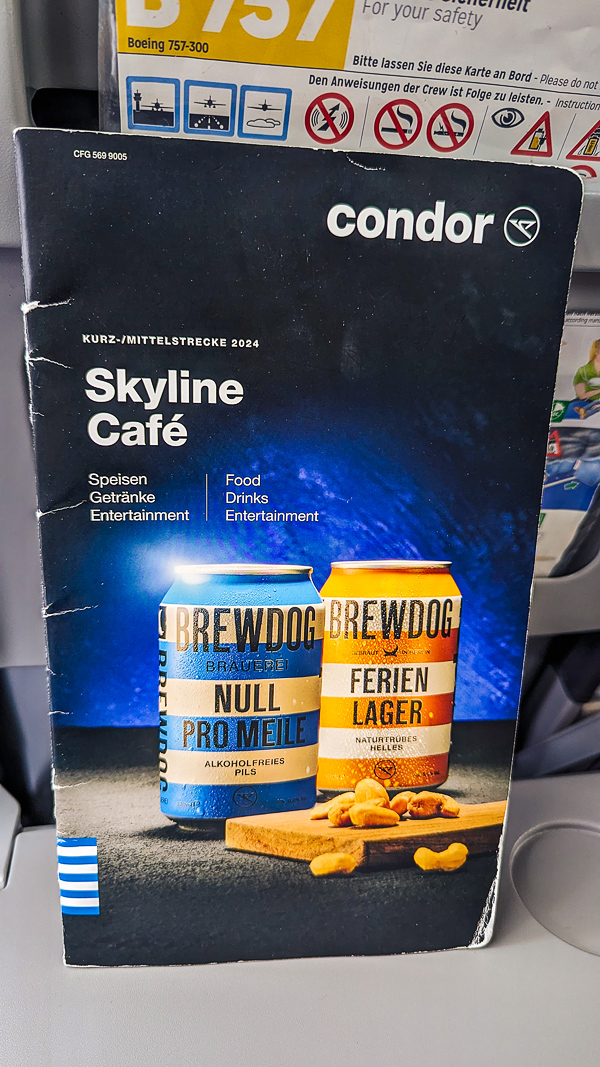 Wir waren überrascht, dass es keine Möglichkeit gab, Snacks aus der Menükarte zu bestellen. Bei Eurowings in der Business Class kann man beispielsweise neben den Gerichten auch Snacks wie Chips und Süßigkeiten kostenlos bestellen. Auf unsere Nachfrage erhielten wir die Antwort, dass dies bei Condor nicht vorgesehen sei. Da in der Karte jedoch nur Getränke wie Champagner und Condorpolitan mit einem Stern markiert sind und die Snacks ohne Stern, lässt das darauf schließen, dass diese in der Business Class kostenlos bestellbar sind. Der freundliche Purser fragte mich dennoch, welchen Snack ich gerne hätte, und bot an, mir diesen ausnahmsweise zu bringen.