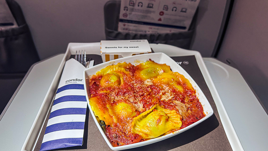 Bedauerlicherweise begann der Flug direkt mit lang anhaltenden Turbulenzen. Trotzdem startete die Crew nach etwa 1 Stunde den Getränkeservice für die Business Class, der sich nicht vom Hinflug unterschied. Beim Essensangebot gab es jedoch Überraschungen. Auf Nachfrage teilte man uns mit, dass wenig Auswahl vorhanden sei, obwohl wir vorbestellt hatten. Letztendlich bekamen wir unser bestelltes Essen – Ravioli und Schnitzel – das sehr lecker war, ebenso wie das Dessert mit Mini-Napfkuchen und Schokoladen Macaron.