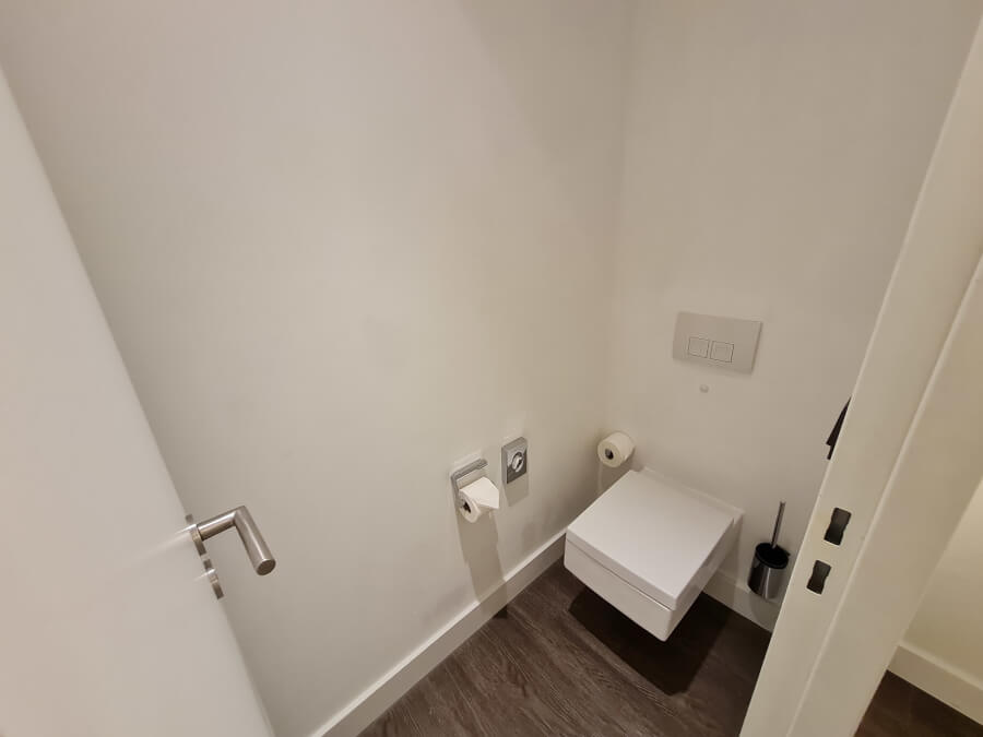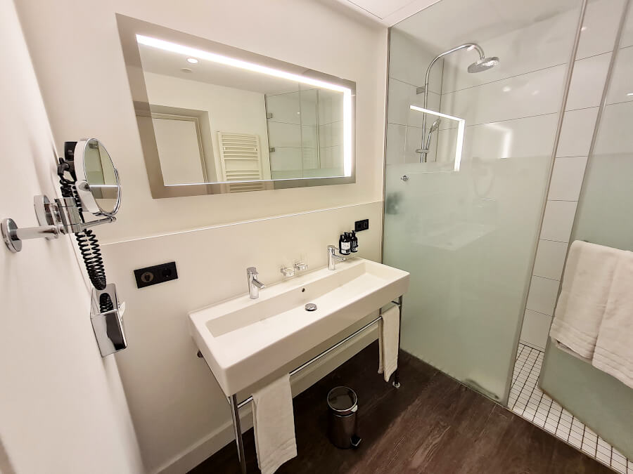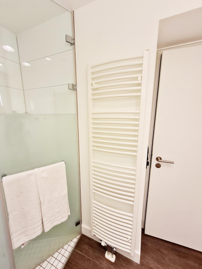 Großartig fand ich die Wärmelampen an der Decke. Diese spendeten nicht nur Wärme, sondern auch sehr viel Helligkeit. Der Heizkörper im Bad, an dem man normalerweise auch Handtücher anwärmen könnte, war, wie erwähnt, leider eiskalt. Auch eine Fußbodenheizung gibt es im Bad nicht.