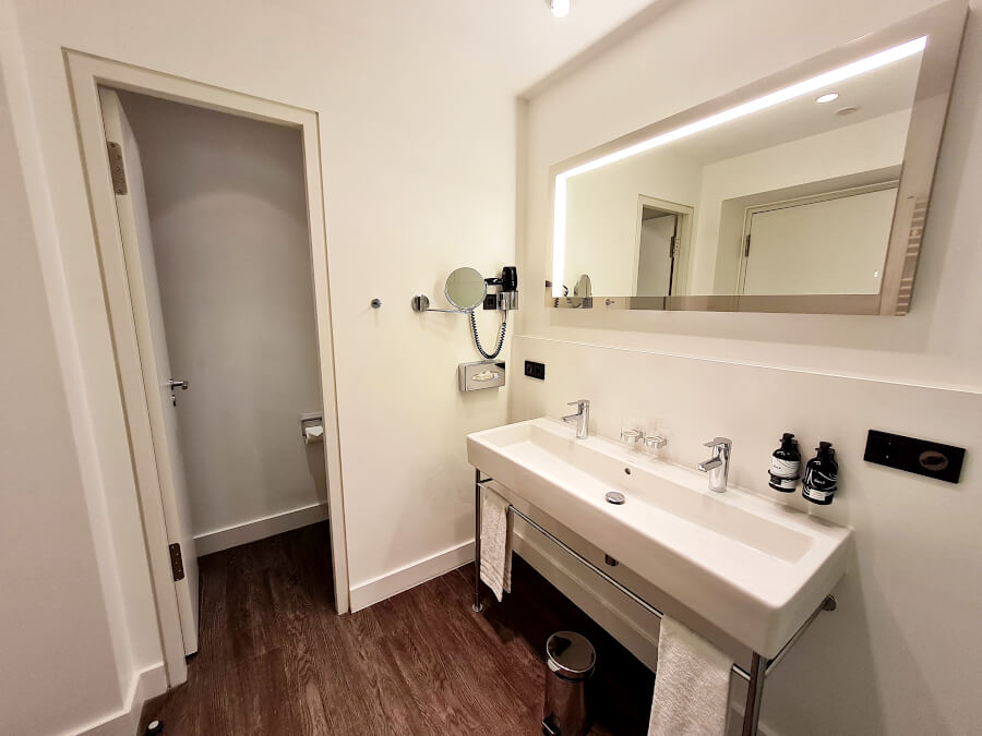 Am Doppelwaschtisch gibt es ebenfalls in großen Spendern Flüssigseife und Bodylotion. Unter Nachhaltigkeitsaspekten positiv, dass alle Produkte in großen Spendern an der Wand angebracht waren.