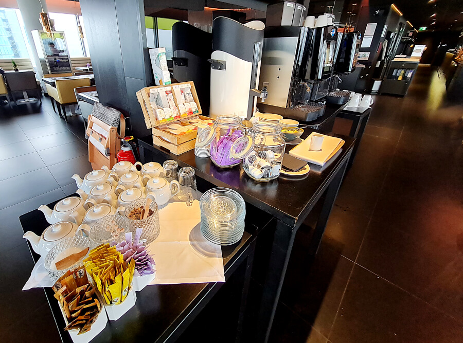 Auf dem Hauptbuffet gibt es außerdem Wasser (still und sprudelnd), Orangensaft (nicht frisch) und Multivitaminsaftsaft, sowie Milch (auch Soja). Außerdem einen Smoothie des Tages.