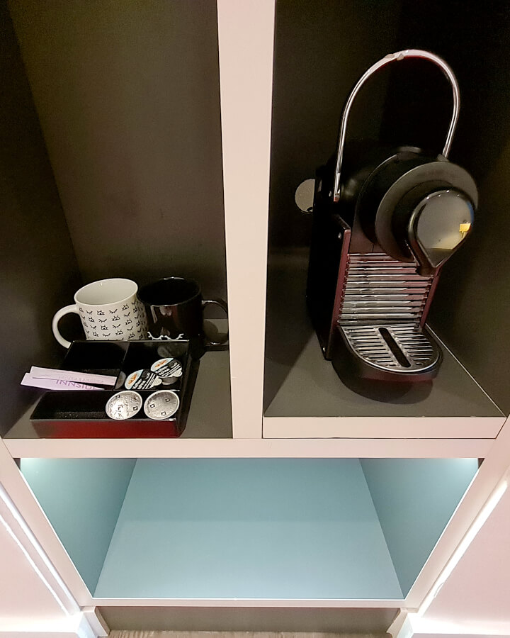 Hier ist ein Mini-Kühlschrank (ohne Getränke), eine Nespresso-Kapselmaschine und ein wenig Zubehör untergebracht. Es gibt keinen Wasserkocher, nur zwei Kaffeekapseln, Kaffeesahne, Zucker und zwei Tassen.
