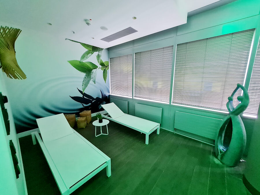 Neben dem Fitnessbereich geht der Relaxbereich ab. Hier stehen eine finnische Sauna, Duschen, zwei Liegen und ein paar Sessel zur Verfügung.