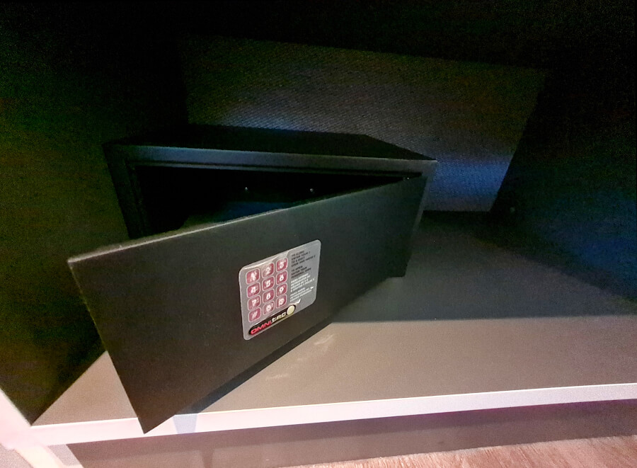 Hier hingen ein paar Kleiderbügel, außerdem warteten auf dem Regalbrett darüber zwei graue Bademäntel und besondere Slipper auf den Gast. Unterhalb gibt es noch ein Fach mit großem Safe. Auf diesem ist neben dem oberen Regalbrett die einzige Möglichkeit etwas abzulegen. Ansonsten gibt es nirgendwo Schrankraum.