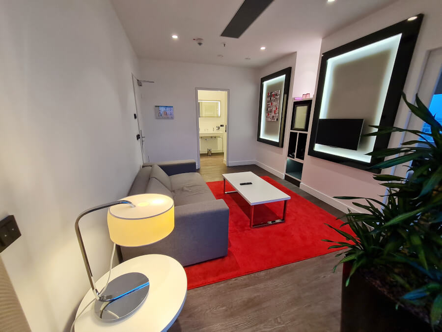 Der Wohnraum ist in kühlen Grau-, Schwarz- und Weißtönen gehalten. Ein Bild mit roten Farbtupfern und der knallige rote Teppich sorgen für Farbakzente. Es gibt ein Sofa, das leider nicht sehr bequem war, einen Couchtisch, einen Beistelltisch mit Lampe und eine Grünpflanze. An der Wand befindet sich ein kleiner Flachbildfernseher mit allen gängigen Sendern plus Sky Sport Bundesliga, Sky Sport / News, daneben ein eingebautes Regal.