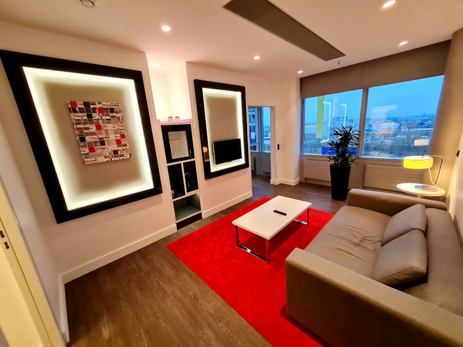 Auf der 11. Etage angekommen findet sich die 46 m² große Suite hinter den Aufzügen am Ende des linken Gangs. Überrascht war ich dann direkt etwas von der Aussicht. Denn man hatte mir einen großartigen Ausblick zugesagt, jedoch war von keinem Fenster aus der Hafen mit Rheinturm, Rhein und Brücke zu sehen. Später erfuhr ich, dass wohl keine der Suiten diesen Ausblick habe. Etwas verwunderlich, da ich bei der besten Kategorie des Hauses auch eine entsprechende Aussicht erwartet hätte.
