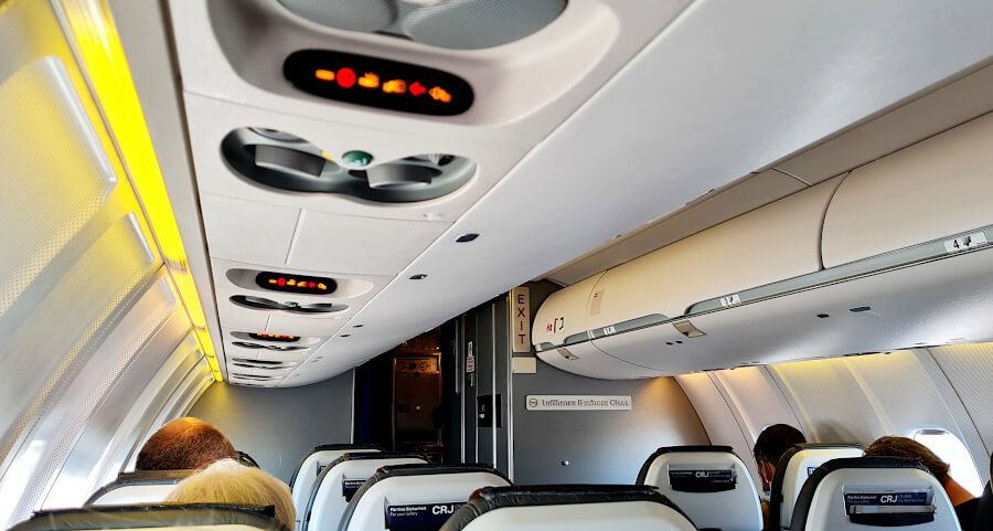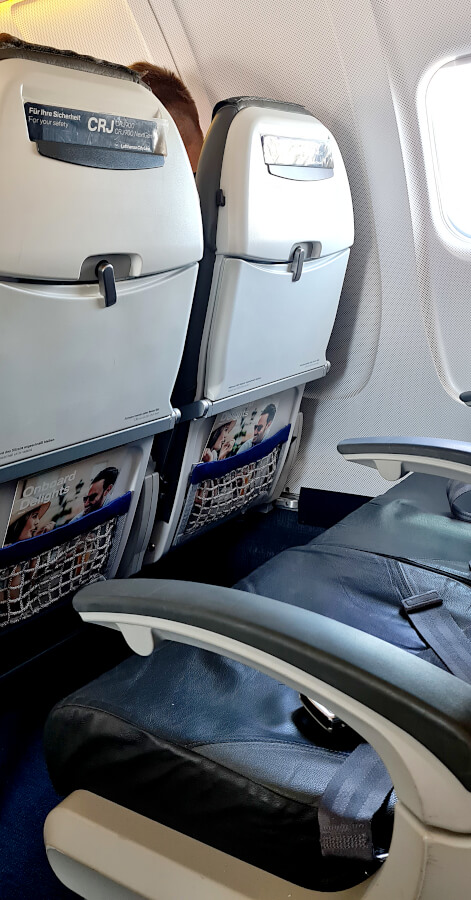 Die kleine und schmale Lufthansa City Line-Maschine bot eine 2-2-Bestuhlung, wobei der Nebenplatz in der Business Class standardmäßig frei blieb ( in 3-3er-Maschinen ist es ein freier Mittelsitz). Dies gehört mit zu den Annehmlichkeiten der Lufthansa Business Class Kurz- und Mittelstrecke, auf der es ja keine „richtige Business Class“ gibt. So bot die Maschine dieselben Sitze wie in der Economy Class, jedoch war die Beinfreiheit ein klein wenig großzügiger bemessen.