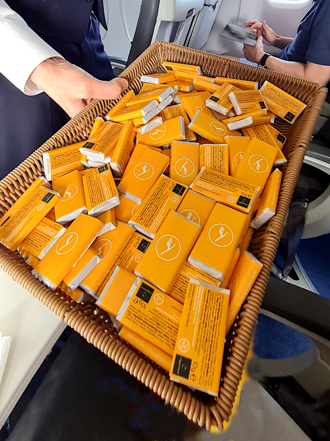 Die sympathische Flugbegleiterin konnte mir auch nicht sagen, was das genau sein sollte und war etwas verlegen, was da auf den Tabletts lag.