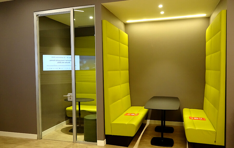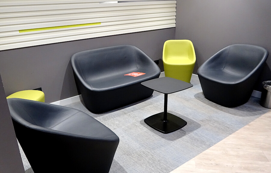Hinter der Tür rechter Hand liegt ein kleinerer Raum, der sicherlich überwiegend zum Arbeiten gedacht ist. Neben einer kleinen Sitzecke gibt es eine Arbeitsfläche mit Steckdosen und mehrere Bürostühlen. Von hier geht auch direkt eine Fast Track-Tür ab, hinter der sich sofort der Sicherheitsbereich befindet.