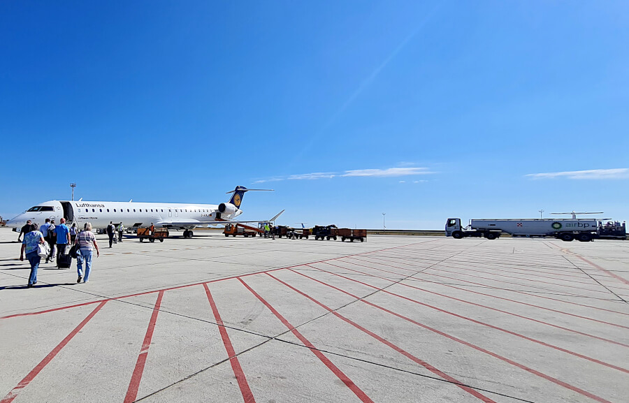 Nach ca. 10 Minuten setzte sich die Schlange dann in Bewegung, aber wieder nur ein kurzes Stück zur Tür raus Richtung Rollfeld. Im Vorbereich hieß es dann wieder warten. Nach weiteren 5 Minuten Wartezeit durften wir dann über das Rollfeld zum Flugzeug gehen.
