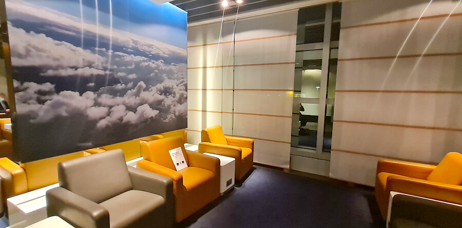 In der gesamten Lounge besteht außer zum Trinken oder Essen die Verpflichtung zum Tragen eines Mund-Nasenschutzes. Direkt hinter dem Eingangsbereich teilt sich die Lounge in mehrere Abschnitte und wirkt dadurch kleiner als sie tatsächlich ist, aber auch gemütlicher in jedem Bereich.