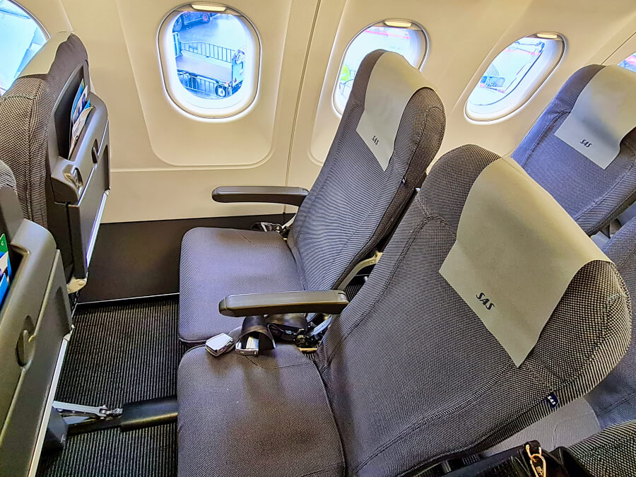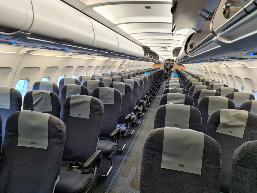 Die schmale Maschine weißt eine 2-2-Bestuhlung auf. Sie ist unterteilt in SASplus (Business Class in den vorderen Sitzreihen) und geht dann, nur mit einem kleineren Aufsteller gekennzeichnet, direkt über in die SASgo (Economy Class).