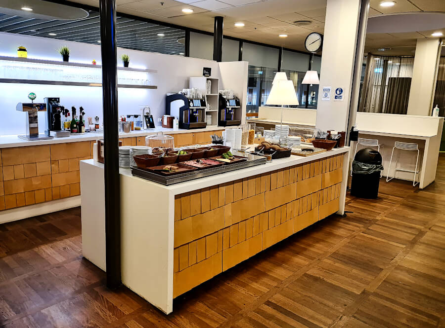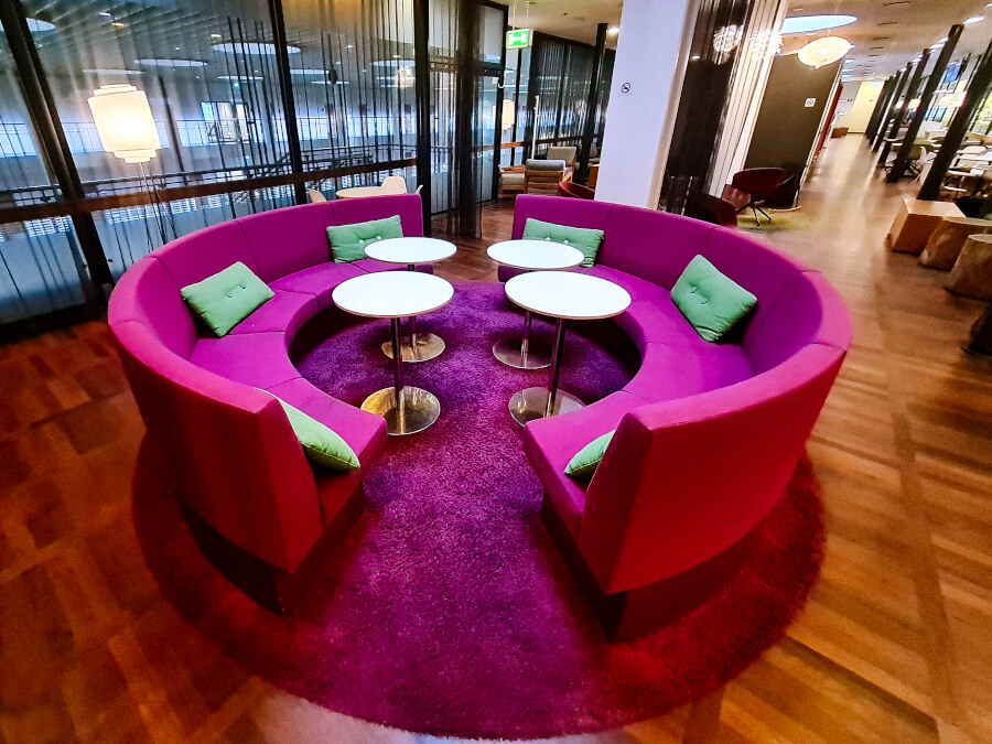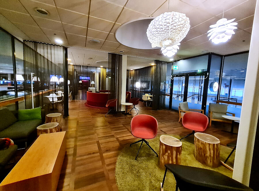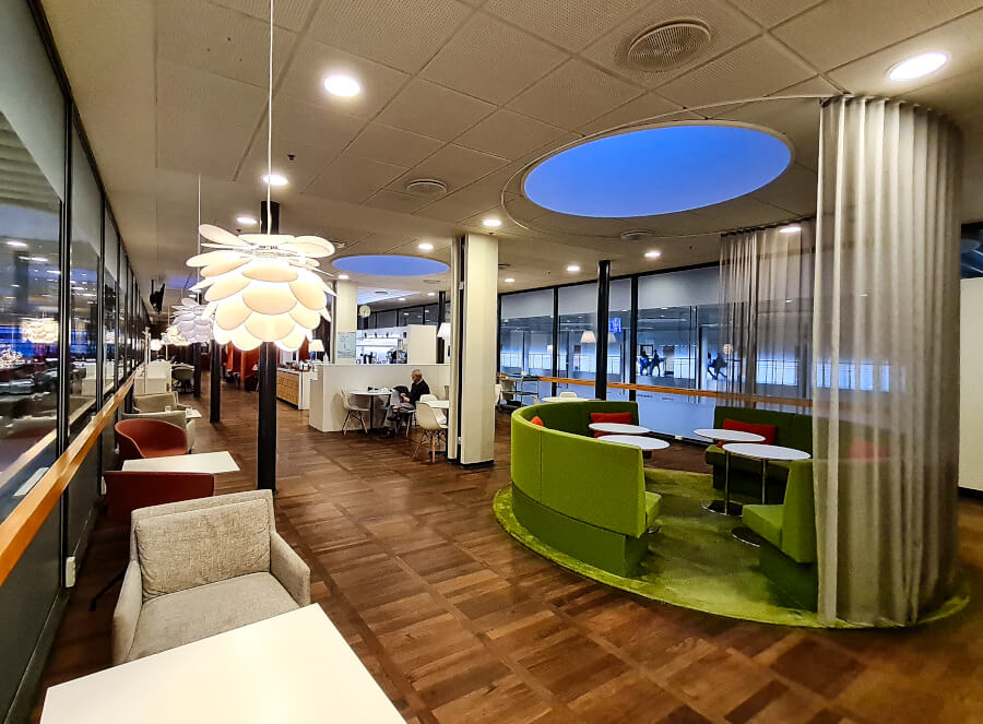 Auch auf diesem Flug war die Maschine nicht einmal halb besetzt, daher ging das Aussteigen zügig vonstatten. Außerdem konnten wir ohne lästiges Busboarding direkt über eine Fluggastbrücke aussteigen, was den gesamten Prozess nochmals angenehm verkürzte. Da ich vorher noch nicht in den Genuss gekommen bin, den Flughafen in Oslo kennenzulernen, war ich angenehm überrascht und beeindruckt von der Modernität und baulichen Attraktivität des Flughafens. Umso betrübter war ich über die schreckliche Leere und die vielen geschlossenen Geschäfte und Restaurants. Corona hat hier anscheinend massiv „zugeschlagen“ und ich hoffe sehr, dass das reizvolle Flughafengebäude bald wieder mit mehr Leben gefüllt werden kann. Da ich bis zu meinem Rückflug nach Deutschland noch genügend Zeit hatte um etwas zu arbeiten, habe ich die Gelegenheit genutzt, zwei der vier Lounges am Osloer Flughafen zu testen. Dank des angenommenen Upgrade-Gebots für den Rückflug in der Business Class (SASplus) hatte ich zum einen Zugang zur SAS Lounge. Zum anderen konnte ich dank American Express Platinum-Kreditkarte auch noch die danebenliegende unabhängige OSL Lounge besuchen.