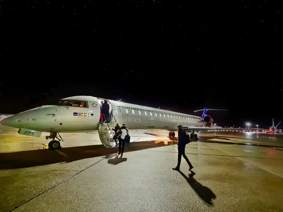 Nach wenigen Minuten Fahrt erreichten wird die kleine Bombadier CRJ900, die über eine schmale ausklappbare Treppe zugänglich war.