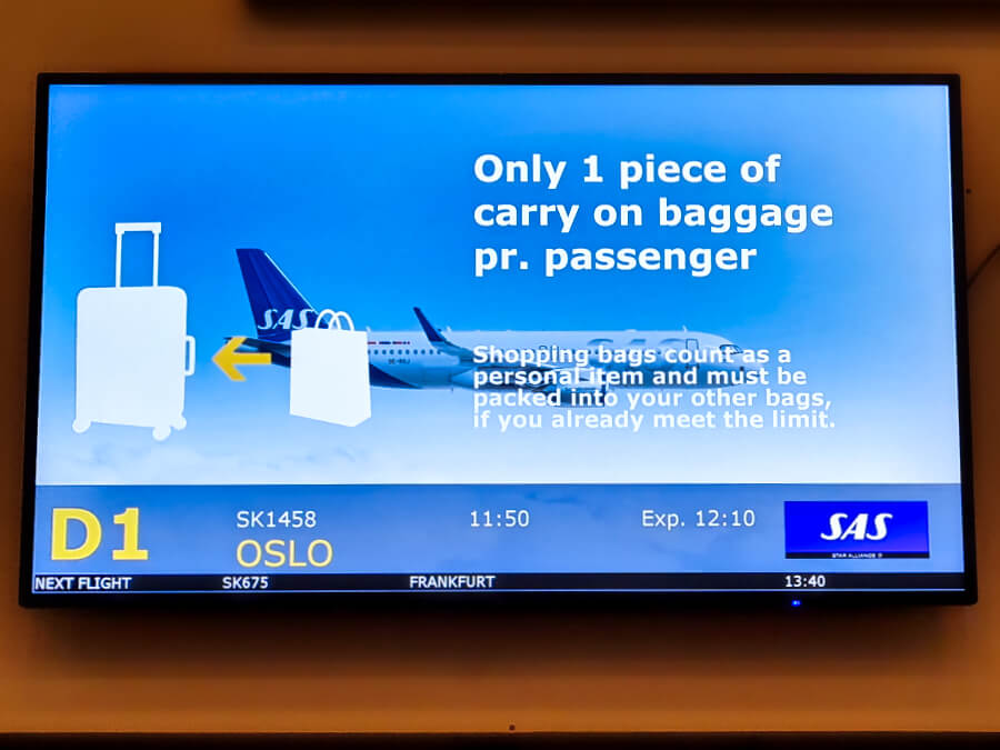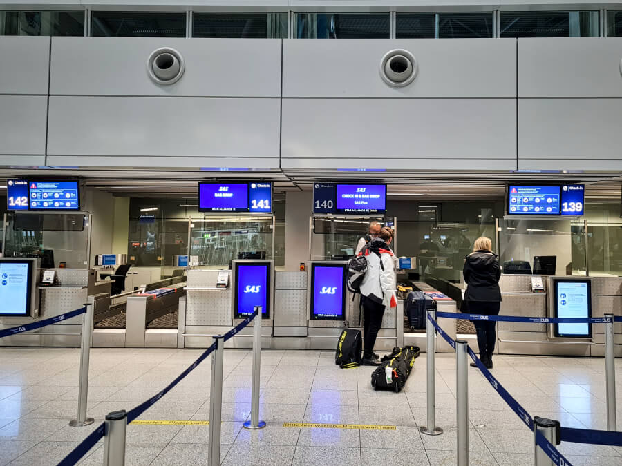Da ich Online nur für den ersten Teil meiner Reise einchecken konnte, aber ungerne in Kopenhagen und Oslo den Transitbereich verlassen wollte, musste ich in Düsseldorf den Check-in aufsuchen. So war ich dann auch recht früh am Flughafen, denn in den letzten Monaten hatte ich mehrfach gesehen hatte, wie lang die Schlangen an vielen Economy-Schaltern waren. Aber ich hatte Glück: Obwohl SAS nur einen Schalter geöffnet hatte, egal ob für Economy- oder Business Class-Gäste, war die Warteschlange äußerst kurz. Lediglich der Umstand, dass die Passagiere vor mir Sondergepäck hatten, ließ die Wartezeit auf 10 Minuten ansteigen.