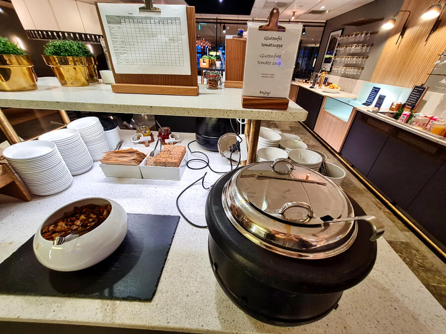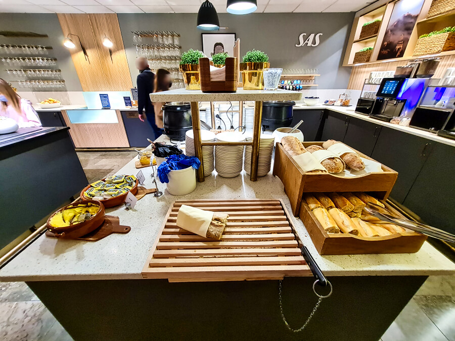Der Buffetbereich direkt hinter dem Eingang der SAS Gold Lounge ist großzügig bemessen und ansprechend gestaltet. Zwei Buffetblöcke boten eine gute Essensauswahl. Zusätzlich fanden sich auf der dahinterliegenden Buffetfläche an der Wand noch Obst, Kekse und glutenfreie Produkte. Ebenfalls ist dort die Getränkeauswahl platziert.