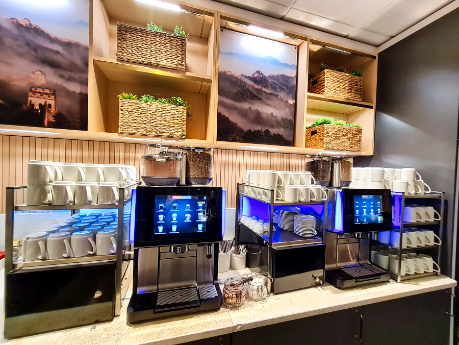 Neben den glutenfreien Produkten befand sich eine kleine Auswahl an Teesorten und Nescafé, daneben warteten zwei Kaffeevollautomaten, an denen man auch heiße Schokolade und Milch ziehen konnte. Der angrenzende große Kühlschrank war zwar komplett mit Bierflaschen gefüllt, dienten aber nur Dekorationszwecken.