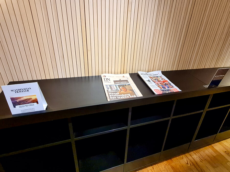 Gegenüber dem Buffet befand sich eine Kommode mit zwei Zeitungen und einem Aufsteller mit Hinweis auf den „Scandinavian Traveller“.