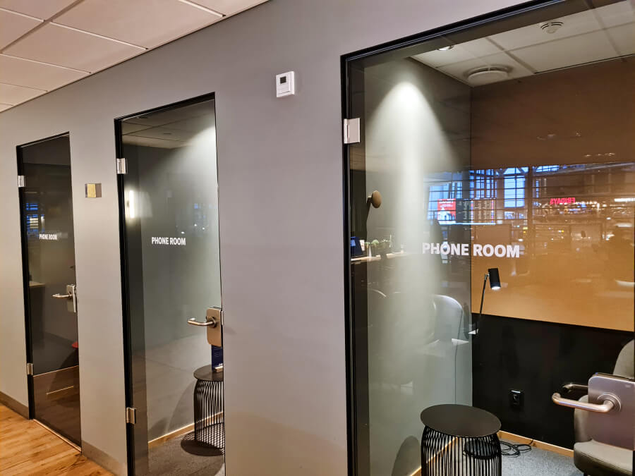 In diesem Bereich gab es außerdem mehrere Kabinen, die mit Glastüren versehen waren. Drei mit einem einzelnen Sessel und Hocker als Telefonkabinen, sowie zwei mit „Guest Office“ gekennzeichnete kleine Räume mit mehreren Sitzmöglichkeiten.