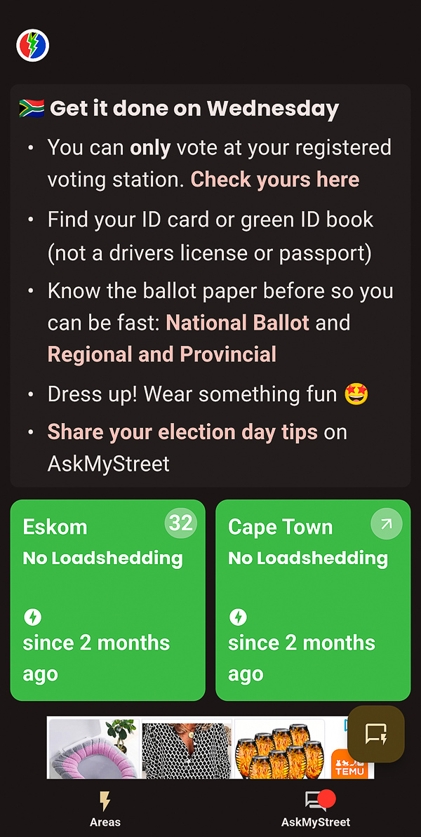 Loadshedding (zu deutsch Lastabwurf) ist ein Begriff aus Südafrika, der geplante Stromausfälle beschreibt, um das Stromnetz vor Überlastung zu schützen. Wegen Stromknappheit, veralteter Infrastruktur und Wetterbedingungen wird der Strom regelmäßig abgestellt. Eskom, der nationale Energieversorger, informiert in seiner App (ESP Loadshedding), welche Gebiete wann betroffen sind, was bis zu 6 Stunden Stromausfall täglich bedeuten kann.