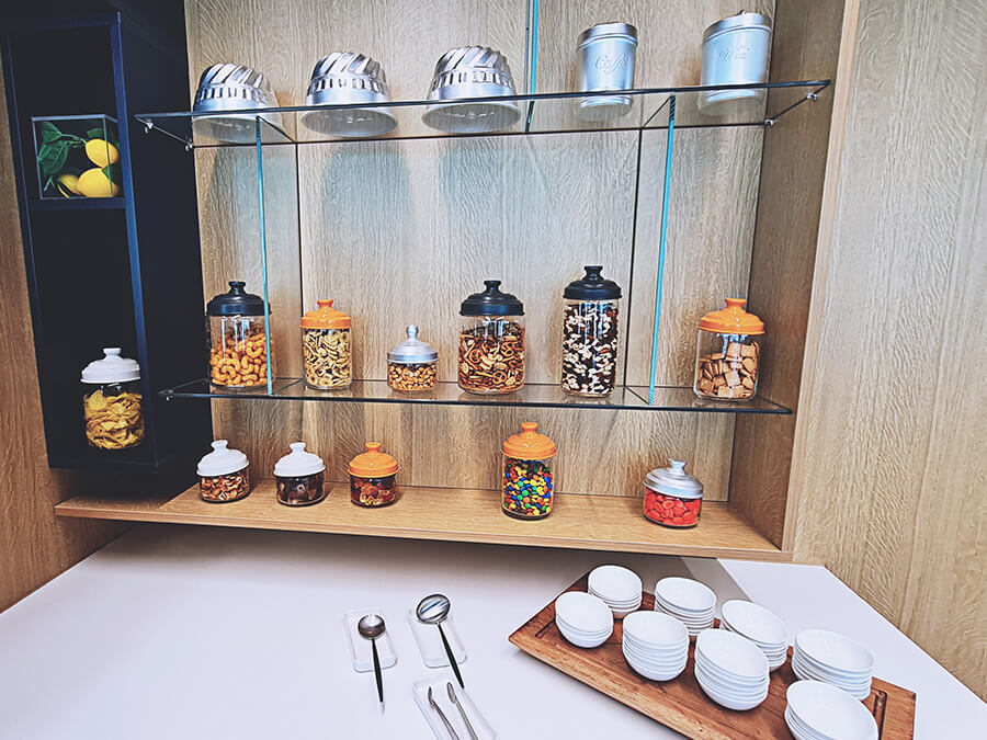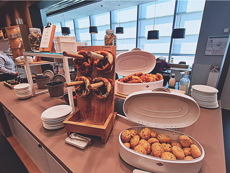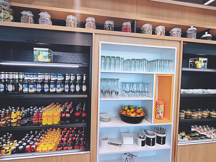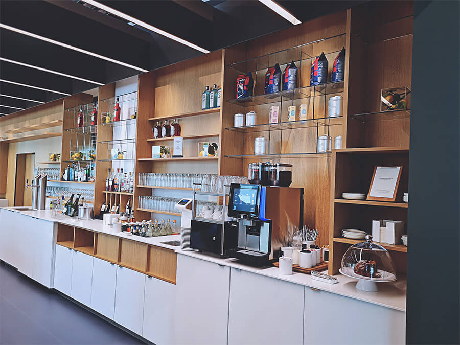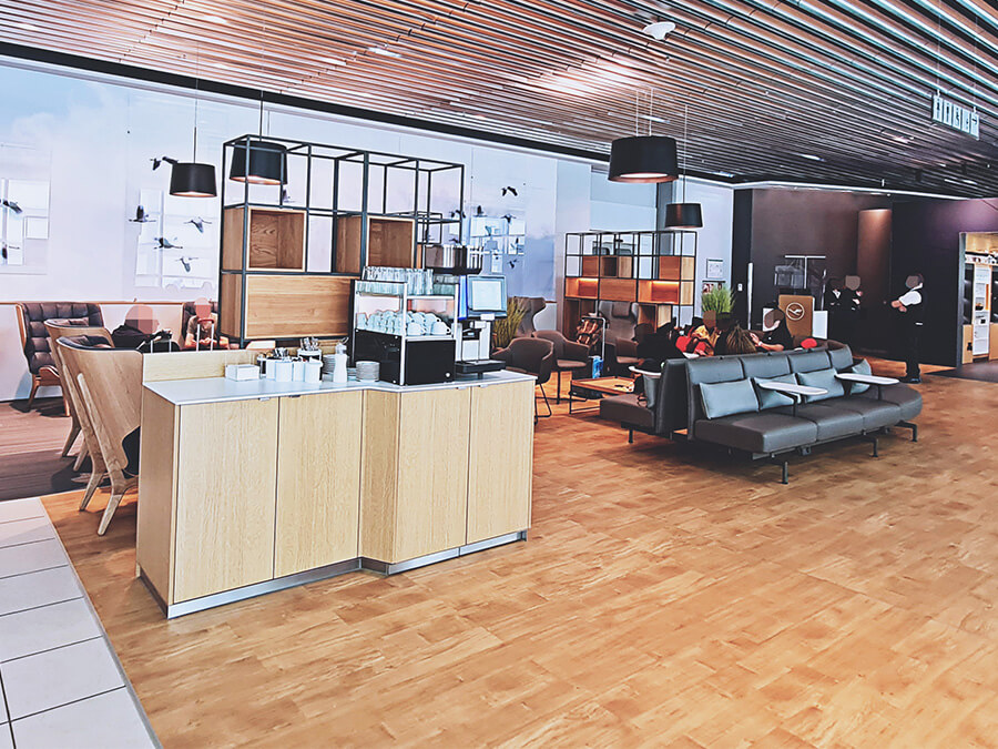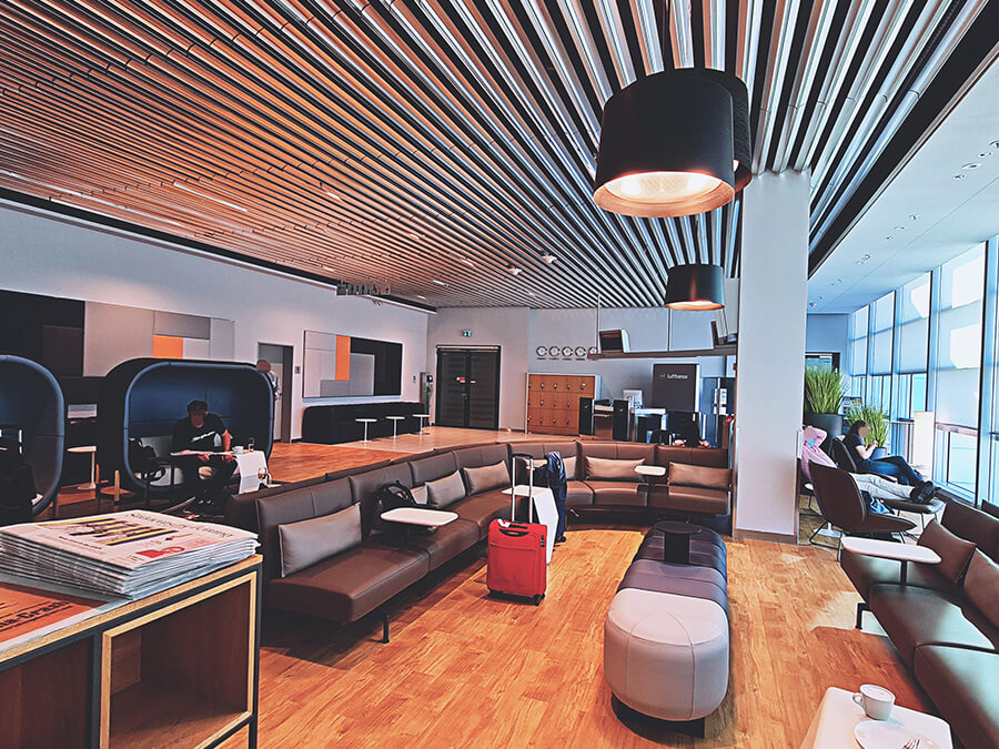 Du musst nicht am Gate auf den Abflug warten, sondern kannst stattdessen eine Business Lounge besuchen. Dort erwarten dich gemütliche Sessel und ein Buffet.